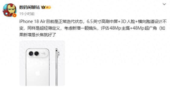 太平洋科技快讯】11 月 7 日消息配资好评配资门户,知名数码博主“数码闲聊站”昨日透露,iPhone 18 Air(预计为第二代 iPhone Air)将保持正常迭代节奏。新机将继续采用6.5英寸高刷新率屏幕、3D人脸识别和镜头 Deco 横向跑道设计,延续其超轻薄定位。