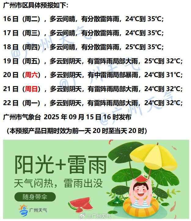 16日,粤西和珠江口西侧市县多云到阴天,有中到大雨,局部暴雨,珠江三角洲中北部市县多云,有(雷)阵雨,其余市县晴到多云,局部有(雷)阵雨。最高气温:粤西和珠江三角洲西部市县29~32℃,其余市县33~36℃。