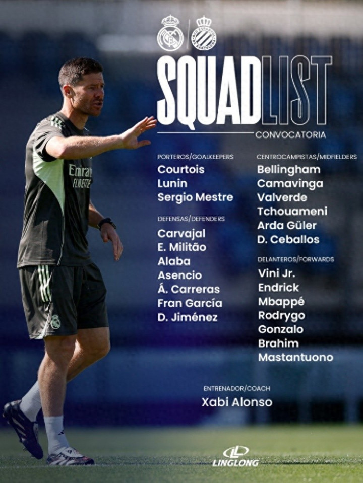 直播吧9月19日讯 北京时间9月20日22:15,2025-26赛季西甲联赛第5轮,皇马将坐镇伯纳乌球场迎战西班牙人。赛前,皇马官方公布本场比赛球队大名单,姆巴佩领衔锋线,恩德里克回归。